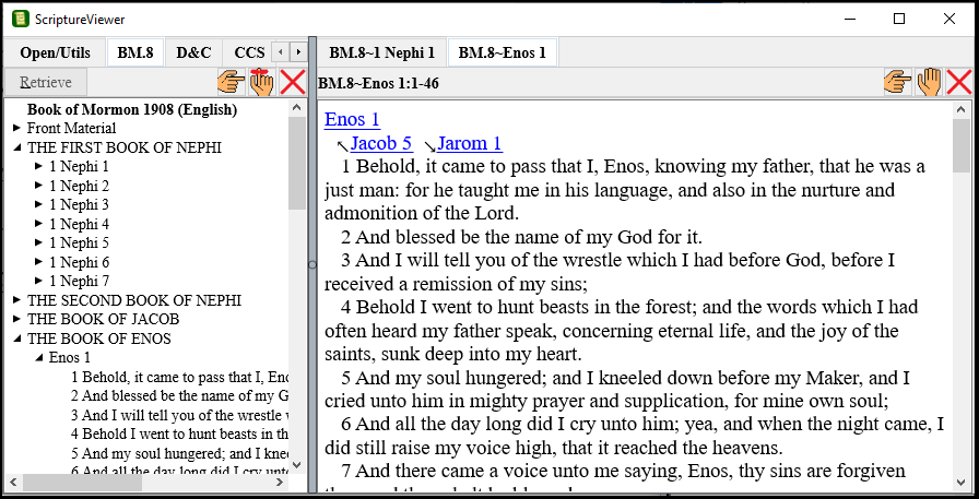 "Treeview" of contents of Book of Mormon and two reading panes from it.