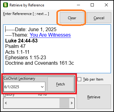 ScriptureViewer provides easy access to the Community of Christ lectionary and worship help links. Press Clear button to remove prior results. Then, using the calendar, select the Sunday of interest and press the Fetch button. An internet query will go out and retrieve the available data for the requested date. ScriptureViewer provides a date-picker and a Fetch button to retrieve the Theme, lectionary scriptures, and when available the link to the online worship helps. To access the online worship helps, click the link that is returned. In addition, when all references are returned to a single tab (when "Tab per Item" is not checked), the date, theme and links are also placed on the resulting composite tab. Retrieving By Reference References may be obtained via the lectionary path described above, or by simply typing them in, or cut/paste from another resource. For Biblical references, a reference consists of a book, a chapter, and a verse. For the Doctrine and Covenants, the 'book' can be the full name, the short form 'D&C' and several varieties in between. Section numbers are used in leiu of chapter numbers. For Community of Christ Sings, the 'book' can be the full name, the short form 'CCS' and several varieties in between. Hymn numbers are used in leiu of chapter numbers. In our example above, each line contains a 'full' reference... book, chapter/section/hymn and verse/range. ScriptureViewer also supports abbreviated references where, when not explicitly supplied, missing leading parts are reused from the previous reference. Multiple references may also be contained on a single line, separated by semi-colon (;) instead of line-breaks. Both are valid in any mix. The 6/1/2025 service helps reference a number of possible hymns. Consider using a request like: CCS 73;623;71;150;110;556;557;23;41;364;523;533;370;381;337Since CCS (the book portion) isn't re-specified each time, ScriptureViewer looks back and sees it was the last referenced. In this case, for each new hymn it looks back and sees the 'book' of 'CCS'. Clicking on the Retrieve button looks through each resource for appropriately named content. Further, ScriptureViewer contains a collection of the book names in English, Spanish and French, and their typical short forms, thus allowing a reference to be used appropriately independent of language and book name differences. See Bible and Book of Mormon Abbreviations. When a supplied name doesn't match any of the collection of book names or abbreviations, then each book is individually checked to see if a match can be made on supplied characters against the leading characters of the book name or variations. |